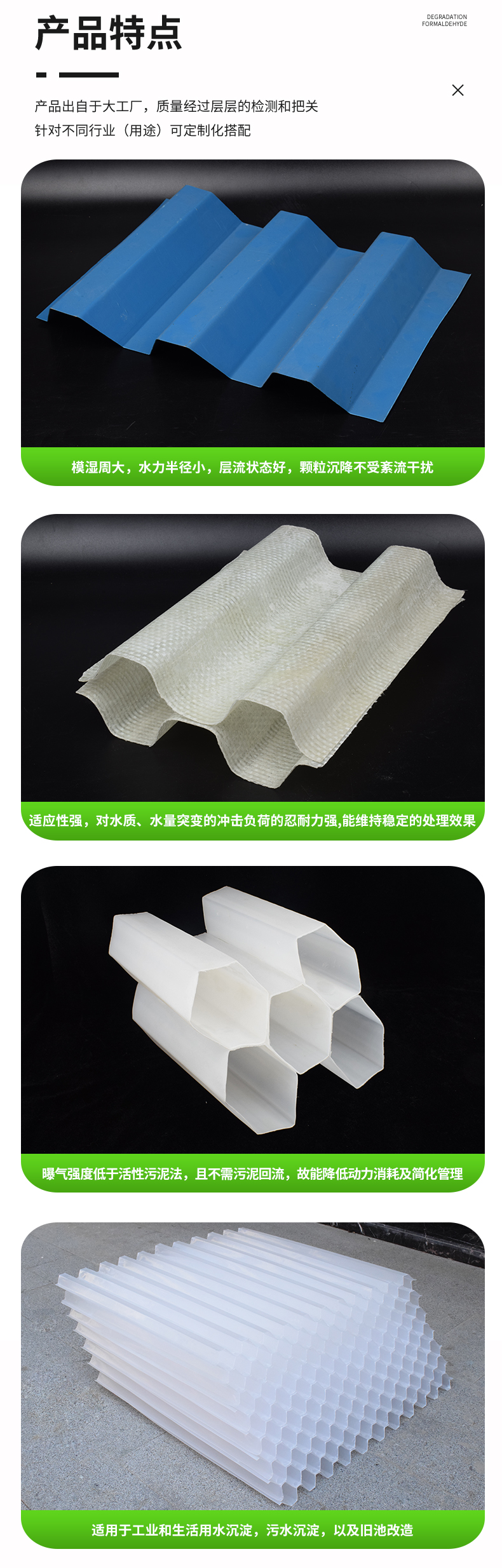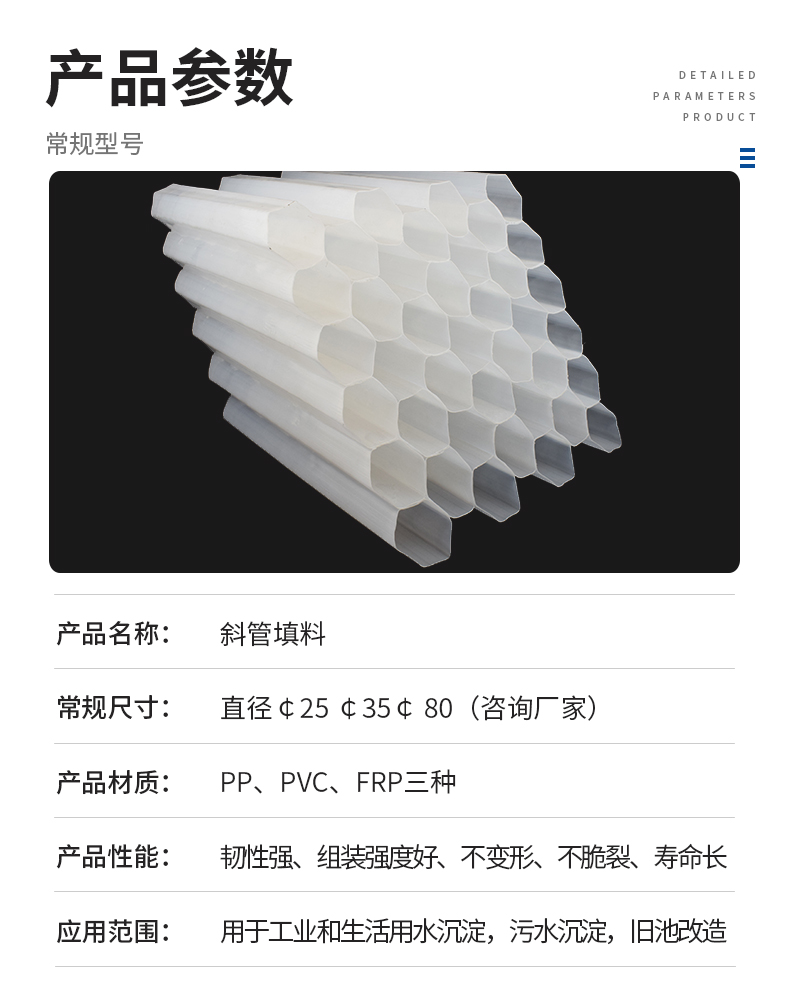 斜管和斜板材質都一樣有聚丙烯、乙丙共聚、聚氯乙烯三種。主要用于各種沉淀和除砂作用。是目前在給水排水工程中采用廣泛而且成熟的一項水處理裝置。它適用范圍廣、處理效果高、占地面積小等優點。適用進水口除砂一般工業和生活給水沉淀,污水沉淀,隔油以及尾礦濃縮等處理,即適用于新建工程又適用于現有舊池的改造,均能取得良好的經濟效益。