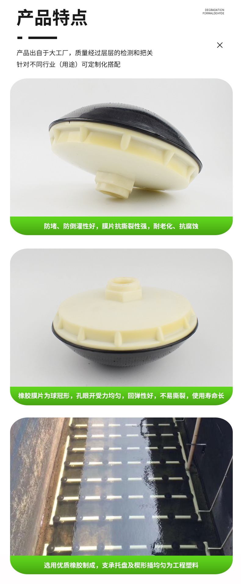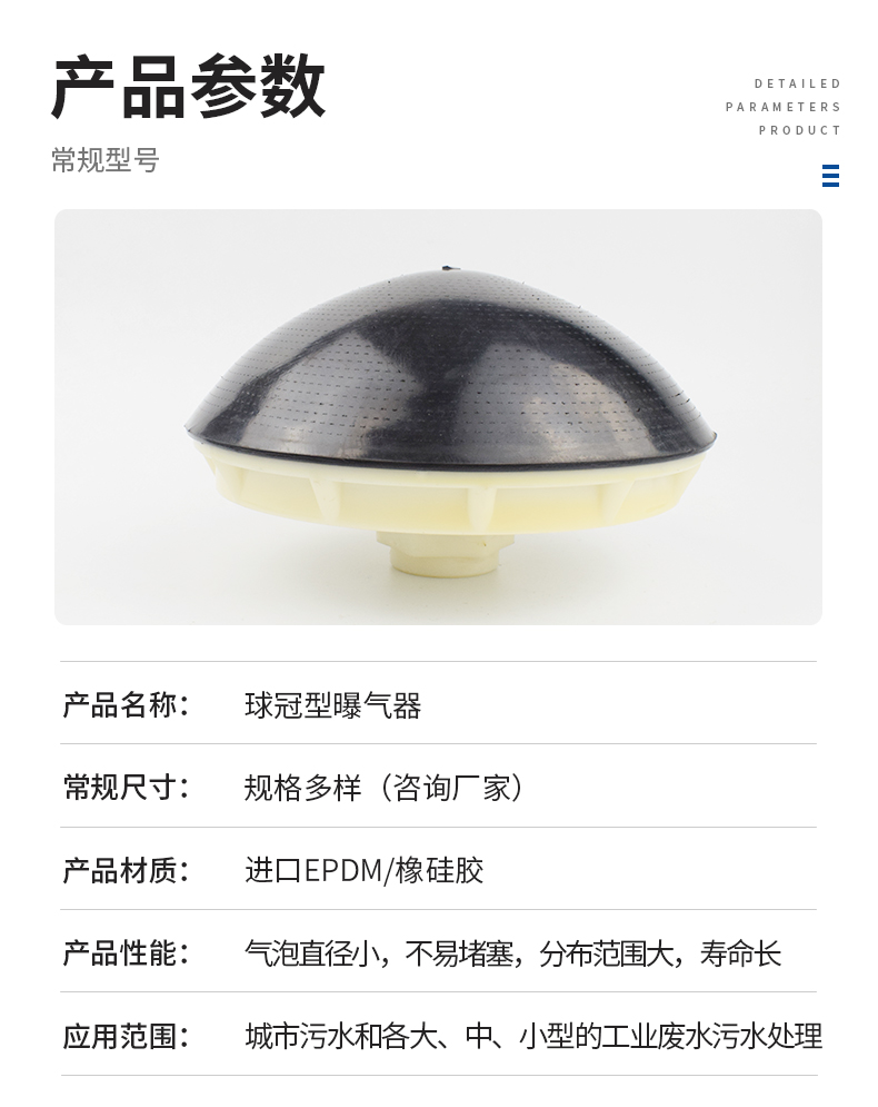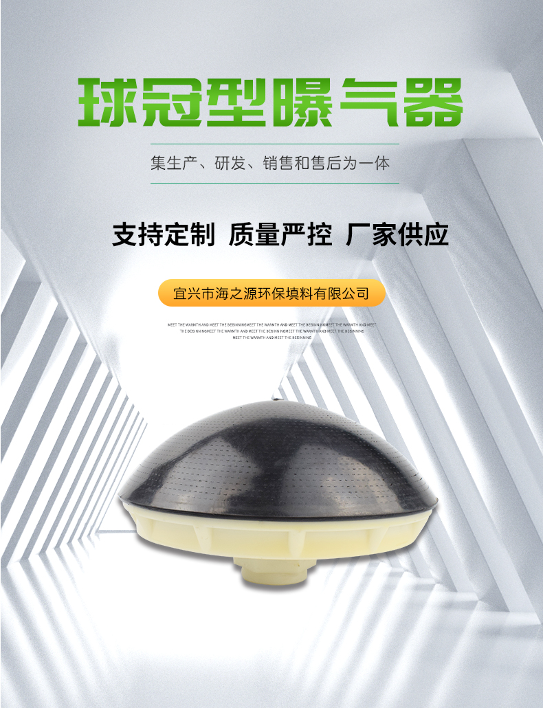 球冠bzo.w-192球冠形可張微孔曝氣器,是我廠根據污水生物處理的工藝特點,在原膜片微孔曝氣器的基礎上,進行專項研制開發的新型曝氣裝置。曝氣器整體結構科學合理、工藝先進、設計新穎、微孔曝氣膜及支承托盤呈獨特的球冠形結構。該曝氣器具有優異的防堵及防水體倒流的性能。在間歇運行工況條件下,曝氣膜表面不易沉淀污泥。較平板膜片式微孔曝氣器使用壽命更長,充氧效率更高,也適用于源水微污染生物處理。
