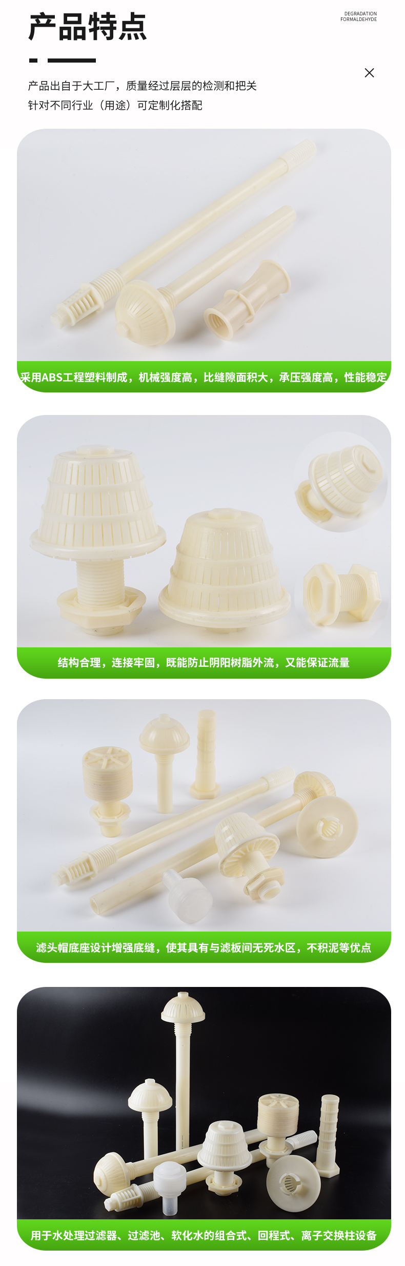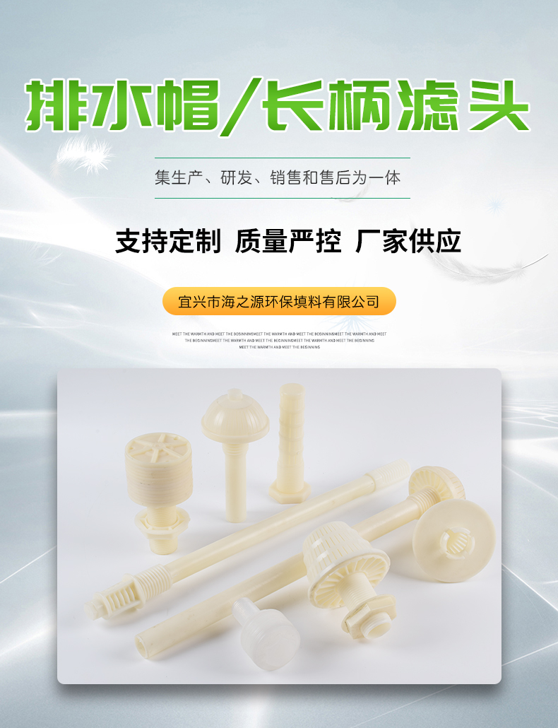 濾頭又叫濾帽,用在濾池配水系統(tǒng)和過濾器中。反沖洗濾頭包括排水帽、濾水帽兩種,均采用ABS工程塑料制成,結構合理,連接牢固,承壓強度高,縫隙不變型,使用效果好,既能防止陰陽樹脂外流,又能保證流量。適用于濾池汽水反沖洗系統(tǒng)和軟化水質組合式,壓力式,回程式及離子交換器等水處理設備的過濾裝置。